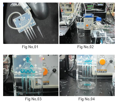 This short test is “ How to separate from single to multiple flow “ and making 4 multi head cartridge. We need to watch of flow in cartridge and cutting clear plate and design of flow space in there. Trouble is come from air inside of cartridge and cannot flow for 4 head. This angle is normal position of multi head. When reverse then easy to control air and easy to dispense.